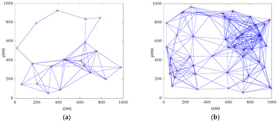 In order to enhance the contrast between the algorithms, there are several common simulation parameters in both groups. In the simulation experiment, 30 or 50 nodes are randomly arranged in a 1000 m × 1000 m area as shown in Figure 5. The communication distance of the node is 350 m, and the simulation time is 300 s with a 4 μs simulation step. The initial phase of the nodes is randomly distributed between 0 and T. The period of the cycle is 1.048576 s. The refractory period of the node is set to 16 μs. The communication delay and frequency drift of the node both influence the synchronization performance [11]. To simulate an extremely poor communication environment in spite of the compensation, we set a 50 ppm frequency drift and 100 μs communication delay. Additionally, a packet loss rate up to 20% is set which is uniformly distributed.