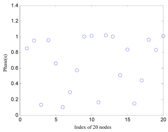 Figure 6 shows the initial phases where 20 nodes are in the non-synchronized state. The synchronization error in the 20-node network is shown in Figure 7. It can be seen that the initial phase of the node set is dispersed in both algorithms. Only the multiscale phase dynamics stimulation achieves phase convergence, and the convergence time is 44 s with an 80 μs error while the standard deviation well is under 26.14 μs. The multiscale phase dynamics algorithm is superior to the RFA in terms of the stability of the algorithm.