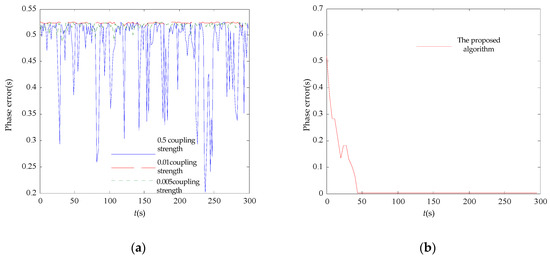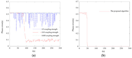 The state vector of each node is recorded at intervals of 1 s and the phase difference of any two points in the network can be calculated according to Equation (3). The maximum value of the difference is taken as the synchronization error. In the typical RFA synchronization mechanism, the coupling coefficient is set as 0.5, 0.01, and 0.005. In the multiscale phase dynamics, the number of multiscale layers is set to three, and the quantization levels are 64, 32, and 32. The minimum quantization resolution is 16 μs and the coupling meets Equation (16) while the coupling coefficient is calculated by Equation (15) dynamically.
