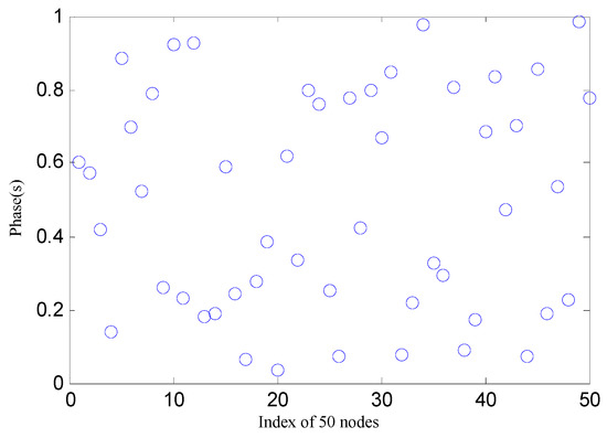 Figure 8 shows the initial phase where 50 nodes are in the non-synchronized state. The synchronization error in the 50-node network is shown in Figure 9. We can see that the initial phase of the node set is dispersed in both algorithms. The RFA is only able to achieve phase convergence with a coupling strength of 0.01, and the target algorithm achieves phase convergence, while the rest are unstable. The RFA converges in a spread interval of 0.11 s while the target algorithm converges in a spread interval of 0.032 ms with the standard deviation well under 0.00876 ms. These results indicate that the synchronization algorithm based on the proposed mechanism is superior to the traditional RFA in both convergence speed and precision.