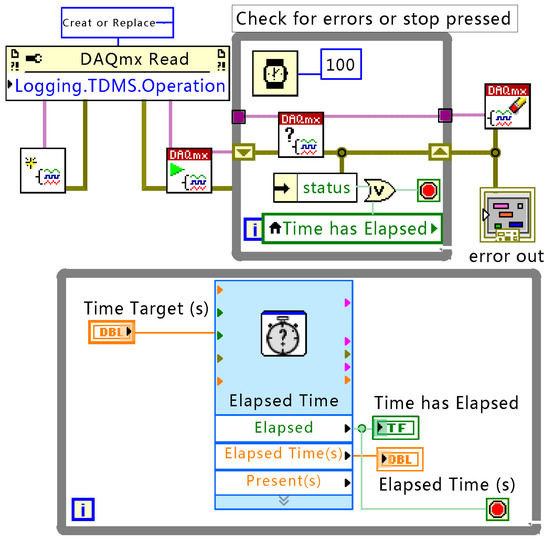 In this experiment, the integrating dynamics are calculated by the timer on the MAC layer in the RF module, and the synchronization period is 1.0486 s. The minimum quantization resolution is 16 μs. In order to maintain a certain degree of consistency with the simulation, as in the simulation, the number of multiscale layers is three, and the quantization levels are 64, 32, and 32. The refractory period is set to 50 μs. To form a non-fully connected network in the laboratory, it is necessary to restrict each node to have at most eight neighbor nodes with which they can communicate directly, and this limits the network connectivity up to a factor of four. Meanwhile, a packet loss rate up to 20% is set by the software. When a node finishes a synchronization period, its MCU will pull up the level of a GPIO port for 300 ms. The GPIO is sampled by NI’s PXIe6358 30-channel digital signal acquisition [34], and the sampling frequency is 100 ksps. For visual observation, the IO port is connected to an LED. The GPIO ports are connected via wires to the digital input channel of the acquisition card while the synchronization is implemented wirelessly. Labview is employed to acquire the real phase value of the 30 nodes on the industrial computer for verification. The block diagram of the acquisition program (the Virtual Instrument block diagram in Labview) is shown as Figure 10.
