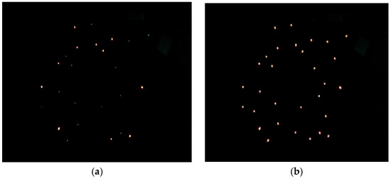 It can be seen in Figure 11 that each node achieves phase synchronization. The maximum error spread of synchronization at each sampling point in time is plotted in Figure 11a. Due to the multiscale phase mechanism, synchronization of the node is divided into three phases. The maximum quantization resolution leads to early rapid decrease of the synchronization error, and the minimum quantization resolution reduces the jitter at later times. Figure 11b shows that the final error spread is in a 50 μs interval with the standard deviation well under 15.42 μs. And the average oscillation period is 1.0485904 s. However, interferences in network may lead to a synchronization error jitter after synchronization, but due to the synchronization algorithm, can still be limited to a certain range. Figure 12 shows the temporal dynamics of 30 nodes in an unsynchronized and synchronized state. In this figure, a vertical bar represents a fire occurrence. Figure 12a shows the chaotic fires in the unsynchronized network. By comparison, Figure 12b has the neat and regular fires in a synchronized state. Figure 13 shows the node synchronization effect. In Figure 13a, the network is in an unsynchronized state. The state at 50 s is shown in Figure 13b, and it can be seen that the network has reached synchronization which requires less than 1600 packets. Therefore, the algorithm achieves synchronization with stability and high performance. The effectiveness of the discrete phase dynamics and algorithm were proven to have a high practical value.