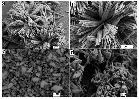 SEM images of (a,b) zinc oxide nanoflower (ZnONF); (c) bare carbon paste electrode (CPE); and (d) ZnONF-modified CPE (ZnONF/CPE).