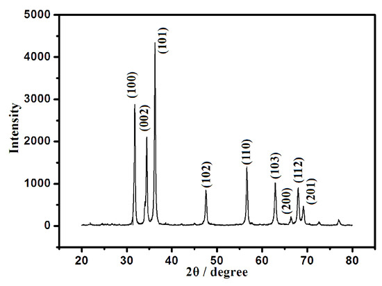 The crystalline structure of ZnONF was characterized by XRD, as shown in Figure 2. Nine peaks of the prepared sample were present corresponding to (100), (002), (101), (102), (110), (103), (200), (112), and (201) crystal face, which agree well with the standard XRD pattern of ZnO (JCPDS Card No. 36-1451) [25,26]. The strong and narrow diffraction peaks indicate that the prepared ZnONF is well crystallized. No characteristic peaks from impurities were detected, indicating that the product is rather pure.