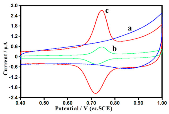The electrochemical behaviors of SY at different electrodes were investigated using cyclic voltammetry (CV) in PBS (1/15 mol/L, pH = 5.0). As shown in Figure 3, there were no redox peaks in the ZnONF/CPE in PBS without SY (curve a). When SY was added into the PBS, a pair of reversible redox peaks were observed in the cyclic voltammograms obtained at the bare CPE with a poor current response (curve b). In contrast, the redox peaks of SY at the ZnONF/CPE were greatly enhanced (curve c), indicating that ZnONF can provide superior electrocatalytic activity to SY. This may be ascribed to the good adsorption ability and large surface area of ZnONF, which increase the loading amount of SY onto the surface of the modified electrode. Therefore, a remarkable increase of electrochemical signal was observed at the ZnONF/CPE.