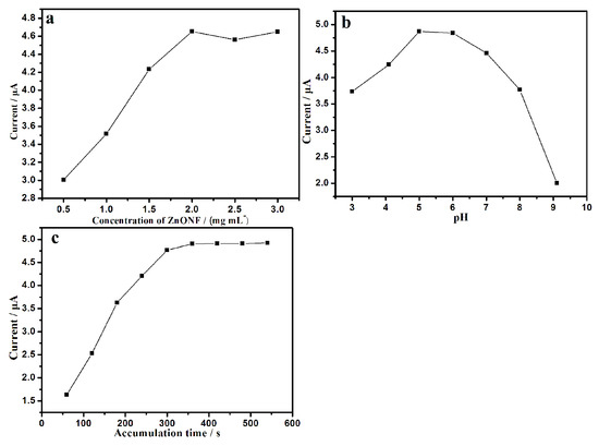 The effect of the concentration of ZnONF on current response of SY was investigated, and the results are shown in Figure 5a. As the concentration of ZnONF increased from 0.50 to 2.0 mg/mL, the current response of SY increased greatly. When the amount of ZnONF was increased, increasing amounts of SY were adsorbed on the surface of ZnONF/CPE, which resulted in a remarkable current response enhancement. As the current response of SY changed slightly when the concentration of ZnONF was greater than 2.0 mg/mL, the optimal concentration for ZnONF was determined to be 2.0 mg/mL.