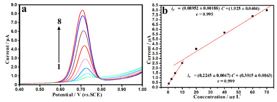 (a) Square wave voltammetry (SWV) curves of SY at the ZnONF/CPE in pH 5.0 PBS with various concentrations. Curves 1 to 8 correspond to 0.50, 2.50, 5.0, 10, 20, 40, 60, and 70 μg/L of SY, respectively; (b) The current response as a function of the SY concentration.
