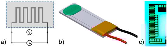 (a) Schematic outline of the electrical circuit used in the experiments; (b) Simplified illustration of the IST FS5 sensor showing the rectangular ceramic substrate with the platinum thin film on top. The green part illustrates a layer of e.g., biofouling; (c) Magnified picture of the sensor tip.