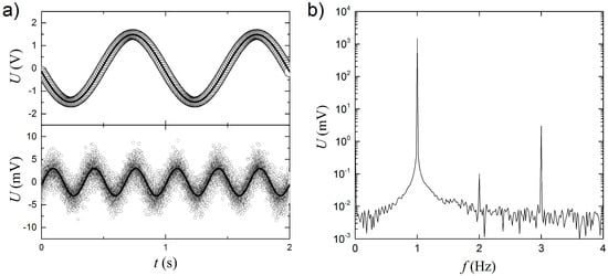 Fourier transforms are used to extract the magnitude of throughout this paper. As Figure 2b shows, the Fourier transform of the raw data in the upper panel of Figure 2a, the whole time series of 60 s has been included. It is seen that there is a good signal to noise ratio of more than 100 for the signal. The amplitudes are found to be 1.49 V and 3.0 mV, respectively, and are in very good agreement with the results from the sinusoidal fits in the raw data analysis. Furthermore, it is noted that the noise level is <0.01 mV and lower than the formal resolution of ~0.076 mV of the 16 bit ADC, because the time series are measured over 60 s, thus improving the practical resolution beyond 16 bit. Unless otherwise stated, the amplitudes are obtained from the Fourier transforms of raw data over at least 10 AC cycles and phase information is not used in the data analysis.