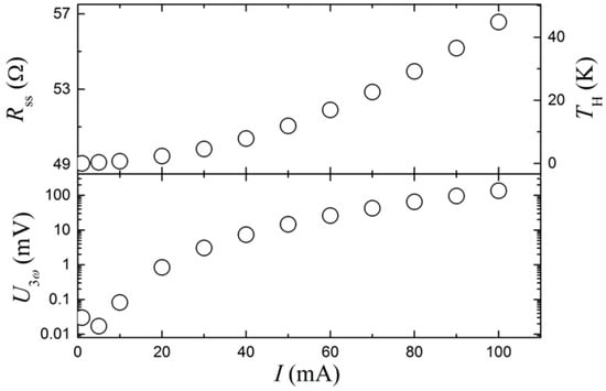 The upper panel shows the electrical resistance () and self-heating temperature () as a function of the current. The lower panel shows the amplitude of the 3ω signal () as a function of the current.