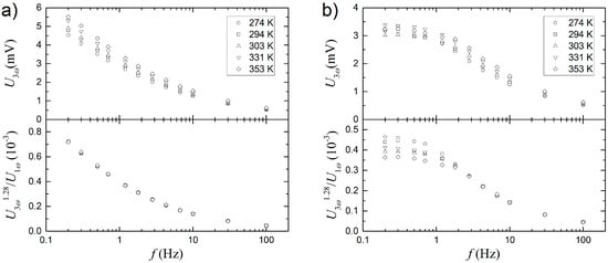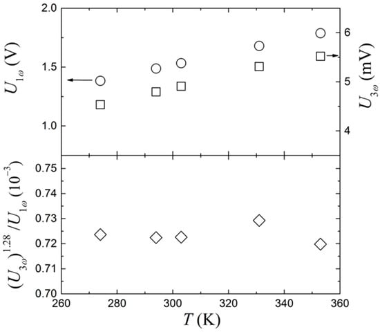 Varying temperatures can be a challenge in resistance-based sensors, where small changes in temperature can have a significant influence on the sensor response. Since both and are influenced by the resistance change of the thin film, it appears feasible to investigate the ratio between the amplitudes of these two signals. Both signals are recorded at different temperatures, in the range of 274 to 353 K. The driving frequency is varied from 0.2 to 100 Hz, but the initial analysis is made with the 0.2 Hz data since these give the largest signals and are thus more sensitive to temperature variations. The data can be seen in Figure 6, where linearly increases with temperature, as expected for a metal like platinum. However, increases with the temperature with a slightly lower power, as and a simple ratio between the two will not be temperature independent. To correct for this behavior, is raised to the power of , where a value of 1.28 has been empirically found to produce the best result (see lower graph in Figure 6), at which point it becomes fully temperature independent within the experimental uncertainties.