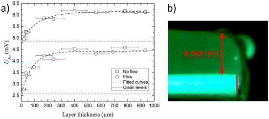 For initial tests as fouling sensor applications, a layer with a well-known thickness is artificially applied to the sensor. A range of substances are tested and it is found that non-water-based hair wax presents the most advantages in terms of depositing layers with well-defined thicknesses and robustness. The wax is applied using a digital micrometer screw to control the thickness of the layer. The actual layer thickness and smoothness is then measured under a microscope (see Figure 8b). The sensor with the deposited layer is placed in a beaker with water and the voltage signal is measured using a driving frequency of 0.2 Hz and an AC current of 30 mA. The signal is measured both with and without stirring in the beaker, to simulate the effects from flow around the sensor. This procedure is repeated for different layer thicknesses, ranging from 11 to 933 µm, and the result can be seen in Figure 8. For both the experiment with and without flow, a clear monotonic increase of as a function of the layer thickness is seen up to about 200–400 µm, after which the response flattens out. The dashed line is a least squares fit to the data, with a reverse exponential decay function. It is seen that there is a relatively large deviation for some points from the fit, and it is anticipated that this deviation is not due to the measurement uncertainty of , but is related to the measurement uncertainty of the actual wax layer thickness. In particular, it was difficult to create perfectly uniform layers around the sensor edge where the metal film is situated and the uncertainty has been estimated to be 25% of the layer thickness, but with a minimum and maximum of 20 µm and 100 µm, respectively.
