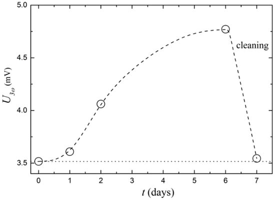 Figure 5 shows how the amplitude of the 3ω signal depends on the frequency without flow around the sensor. At frequencies below approximately 1 Hz, is a linear function of , as expected in the low frequency limit []. Figure 5 also includes the magnitude of the temperature oscillations (), assuming that the Cahill formula [] for holds. Here, it is seen that the maximum is less than 2 K at 0.2 Hz. Additionally, it presents the thermal wavelength , where the thermal diffusivity for water ( 0.145 mm2/s−1) has been used []. decreases from about 0.24 mm at 0.2 Hz, to only 0.01 mm at 100 Hz. The thermal wavelength or thermal penetration depth is a rough measure of the maximum measurement depth of e.g., the fouling thickness. When choosing the driving frequency for a measurement, there is a trade-off between a large signal amplitude () with a large measurement depth on the one hand, and a fast response time on the other. A minimum measurement of 10 cycles is kept as a criterion, and unless otherwise stated, a frequency of 1 Hz is used throughout the experiments in this work. When conducted in water at room temperature, this results in 3 mV, a thermal penetration depth of about 120 µm, and a minimum measurement time of 10 s.