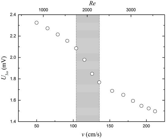 Figure 10 shows the response at different flow rates. A shift in the generally linear trend appears just above 1 m/s, which corresponds to a Reynolds number of about 2000, which is the normal onset for laminar to turbulent flow. In this range, marked by the grey section in Figure 11, a larger decrease in is observed. Once the flow reaches the fully turbulent flow it follows the same slope as when the flow is laminar. The functional behavior in Figure 10 is fully in agreement with that which was expected. An increased flow speed transports heat away more efficiently, corresponding to a larger thermal conductivity and lower . It is also well-known that the heat transfer coefficient for turbulent flow is higher than for laminar flow, and for this reason, the slope in the flow transition range is higher.