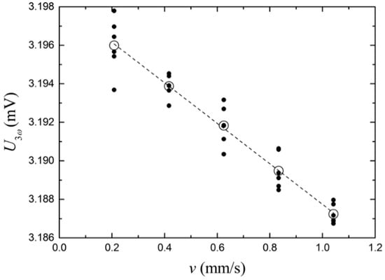 Figure 11 shows as a function of the flow speed at much lower flow velocities, obtained by the combined use of a flow cell with a larger cross sectional area and a WPI AL-1000 (World Precision Instruments, Sarasota, FL, USA) syringe pump for low flow rates. Here, data are collected over a period of 60 s, and the data for different succeeding experiments with the same flow speed are plotted as solid data points. At the same time, the average values for the five data points are included as open data points. The dashed line is a least squares linear fit to the data, where the slope is 0.0105 V/(m/s). From the variance of the data points between each flow speed, the sensitivity is estimated to be around 0.2 mm/s for measurements recorded over 60 s, but much lower if data are averaged over several data points, as seen from the coincidence of the fitted curve and the averaged data points. This demonstrates one of the advantages of AC techniques and the ability of low flow speed measurements.