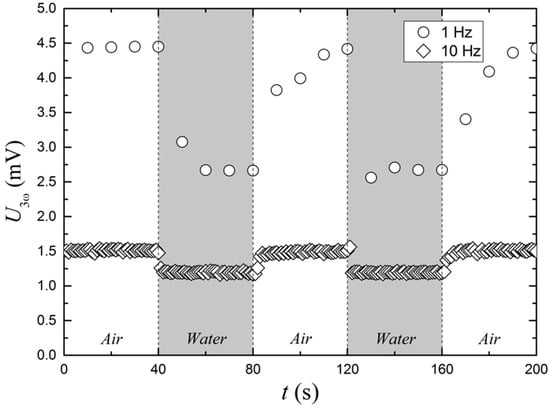 With a factor of more than 20 between the thermal conductivities of water (606.2 mW/(m·K)) and air (26.2 mW/(m·K)) [], it is obvious that a sensor utilizing a thermal conductivity measurement like the 3ω method can be used as a contact sensor for the measurement of the presence of water or other liquids and objects touching the sensor. Here, one of the main issues is the response time of the sensor. A minimum of 10 AC cycles is demanded for an acceptable quality of the Fourier transform and a measurement time of 10 s is needed for a driving AC frequency of 1 Hz. The result of such a measurement can be seen in Figure 12, where amplitudes of 4.45 and 2.66 mV for air and water, respectively, are observed. To decrease the response time, the driving frequency is increased to 10 Hz and the measurement time reduced to 1 s. The improvement of the response time comes with the cost of the reduced amplitude, i.e., 1.51 and 1.19 mV for air and water, respectively. The ratio of the signal in air to the signal in water is also reduced from 1.67 to 1.26, when changing the driving frequency from 1 to 10 Hz.