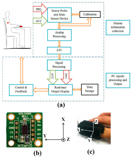 (a) Experimental setup of the custom sensor system; (b) Accelerometer and (c) Finger Clip with axes orientation.