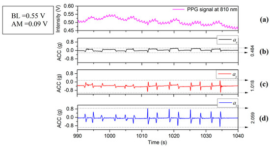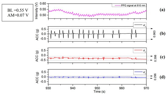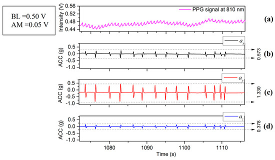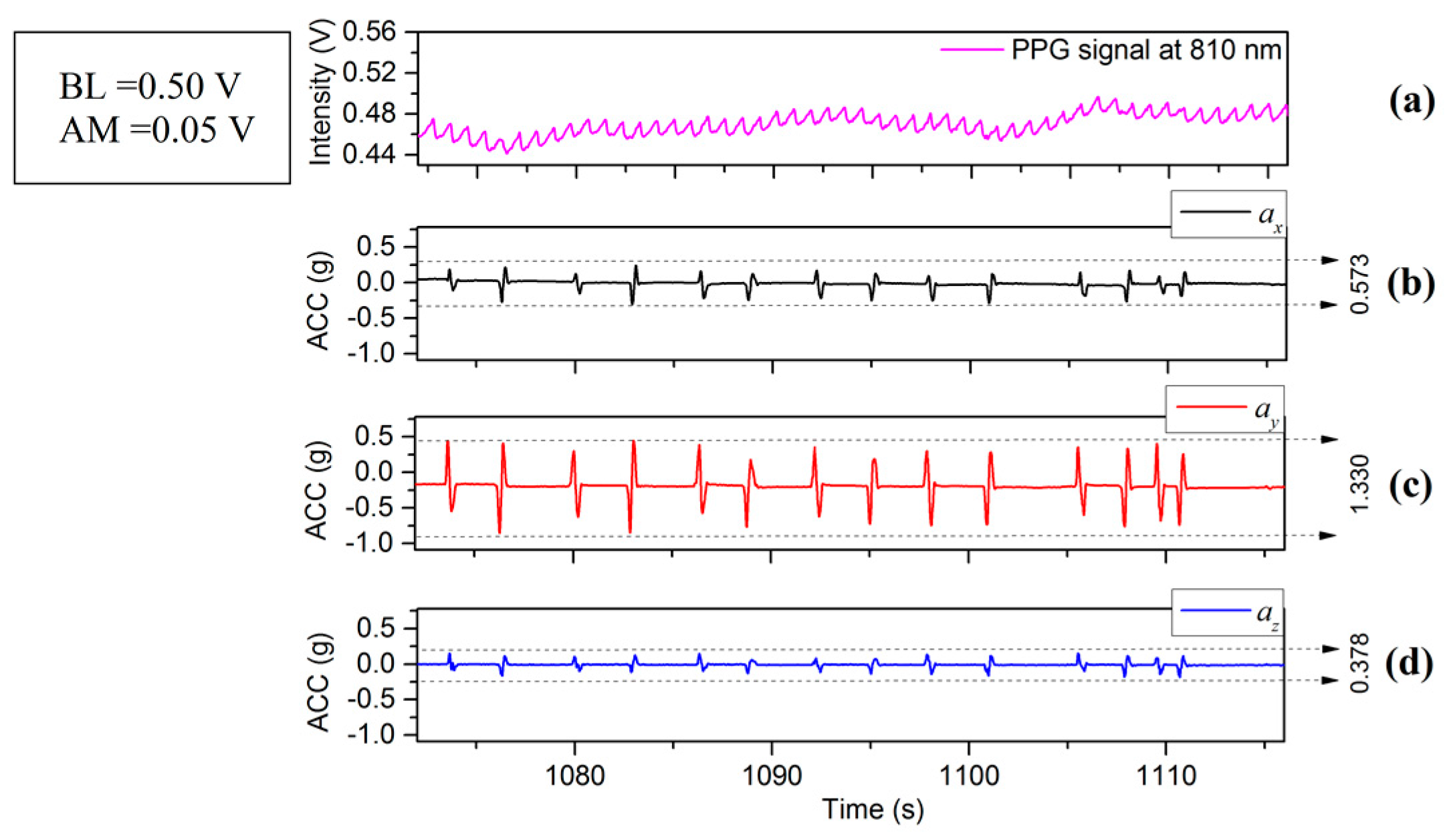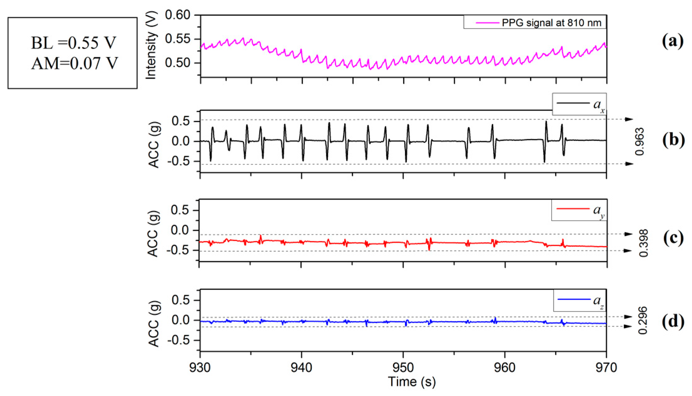 Figure 2, Figure 3 and Figure 4 depict the time varying PPG signals at a wavelength of 810 nm and ACC signal the accelerometer signals (ACC) signal measurements with predominant acceleration applied in the X, Y, and Z directions respectively. The results of Figure 2, Figure 3 and Figure 4 show that the design of the PPG probe in this investigation has been successful and there appears to be minimal effect accruing from motion on the PPG signals in the respective directions (X, Y and Z). Figure 2 corresponds to the case of the motion applied in the X-axis direction, in which case accelerations applied in the Y-axis and Z-axis directions were controlled to be as small as possible. The resulting acceleration signals are shown in Figure 2a (X) and Figure 2c,d (Y and Z respectively). The acceleration in the X direction, is whereas (Y direction) and (Z direction) are and . The time varying PPG signal during this motion event is shown in Figure 2a and the variation of mean values is affected by a lower frequency component mainly from respiration [19]. Nitzan et al. [20] have also stated “Photoplethysmography (PPG) provides a qualitative measure of the tissue blood volume increase during systole by measuring the light transmission through the tissue as a function of time.” The time period relating to our study is not fixed (Figure 2, Figure 3 and Figure 4) but is generally in the range of multiples of 10’s of seconds (usually between 20 and 30 s). In order to introduce a quantitative measure of the PPG signal change and (amplitude) and offset from the zero line (analogous to DC component) during this phase the definition has been applied to each record for the duration that is captured. The peak value in the PPG waveform, defined in terms of baseline (BL) (being the difference between 0 and the maximum value of this waveform during the interval) [20], and amplitude (AM) of a PPG signal, are also illustrated in Figure 5. Results of acceleration applied mainly along the Y-axis direction are illustrated in Figure 3. The acceleration is whereas and are and . However, when acceleration in the vertical (Z) direction is dominant, i.e., in Figure 4d with the acceleration is whereas and are and respectively. The PPG signal (Figure 4a) therefore shows stronger fluctuations than the case in Figure 2a or Figure 3a. It therefore appears that PPG signals are more greatly influenced by acceleration applied in the Z-axis direction. It is acknowledged that the acceleration values in the case of Figure 4a are greater than either Figure 2a or Figure 3a, but the effect on the waveform of the zaxis acceleration is visibly different in the case of Figure 4a than either Figure 2a or Figure 3a, the signal in the former case showing a stronger oscillatory characteristic which broadly correspond the appearance of acceleration pulses and are not as clear or even present in Figure 2a and Figure 3a for which the dominant applied acceleration is in the horizontal plane.