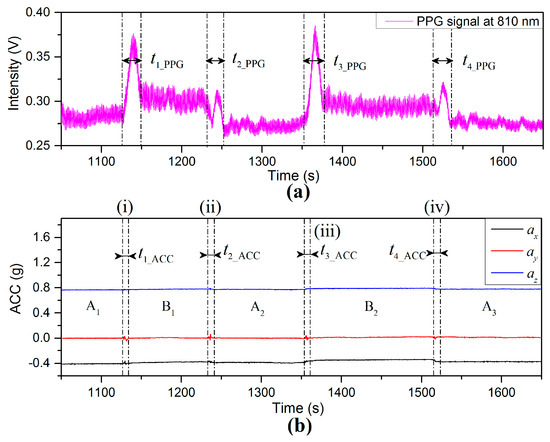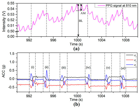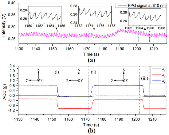 Figure 17a,b show the PPG and X-axis acceleration signals in the process of swinging the arm up and down by rotation at the shoulder. The positions of the finger sensor probe are indicated by the ax signals in Figure 17b, where dotted lines (i), (ii), and (iii) mark the sensor probe at 35 cm above heart level, heart level, and 35 cm below heart level, respectively. Dotted lines () mark the probe rising from 35 cm below heart level to the heart level, dotted lines () mark the start of the probe moving from heart level to 35 cm above heart level, dotted lines () mark the probe being lowered from 35 cm above heart level to heart level, dotted lines () mark the changes of the probe from heart level to 35 cm below heart, et al.