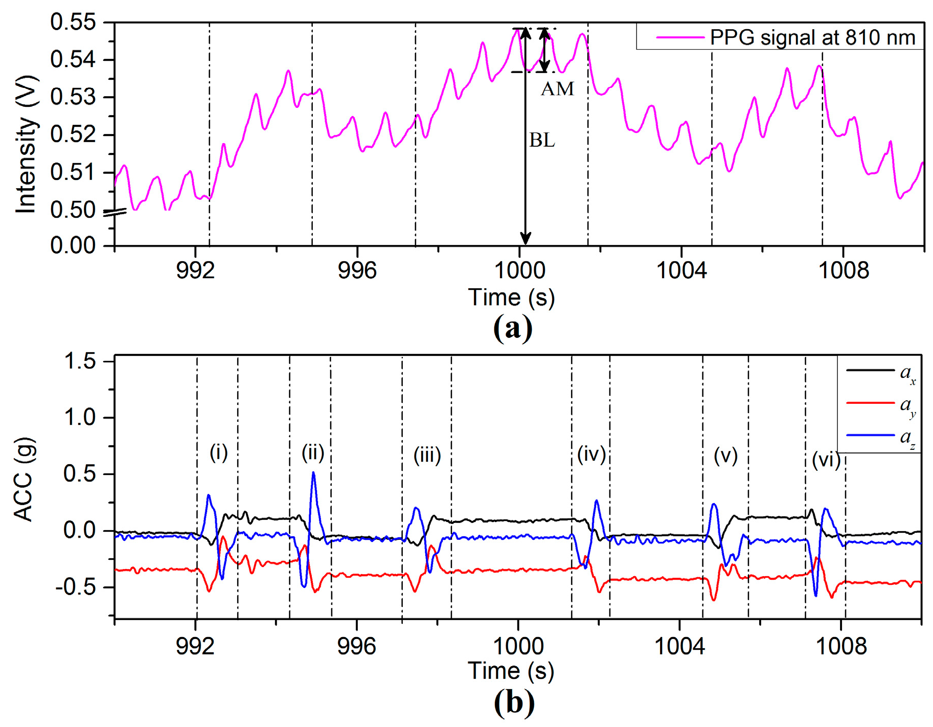 The PPG waveforms and ACC signals in the interval 990–1110 s in Figure 4 are shown in greater detail in Figure 5. Each acceleration event in the positive Z-axis direction, marked by regions of odd numerals (i, iii, and v) in Figure 5b, leads to an increase in BL, and meanwhile each acceleration in negative Z-axis direction, marked by regions of even numerals (ii, iv, and vi), represents a decrease in BL. The waveform is therefore most strongly influenced by movement in vertical Z-axis direction compared to motion in the horizontal x-y plane. The research in this investigation is aimed at the exploration and analysis of the properties of the PPG signal affected by physiological parameters associated with motion as described in the following sections.
