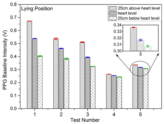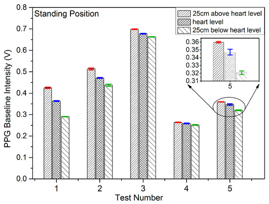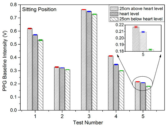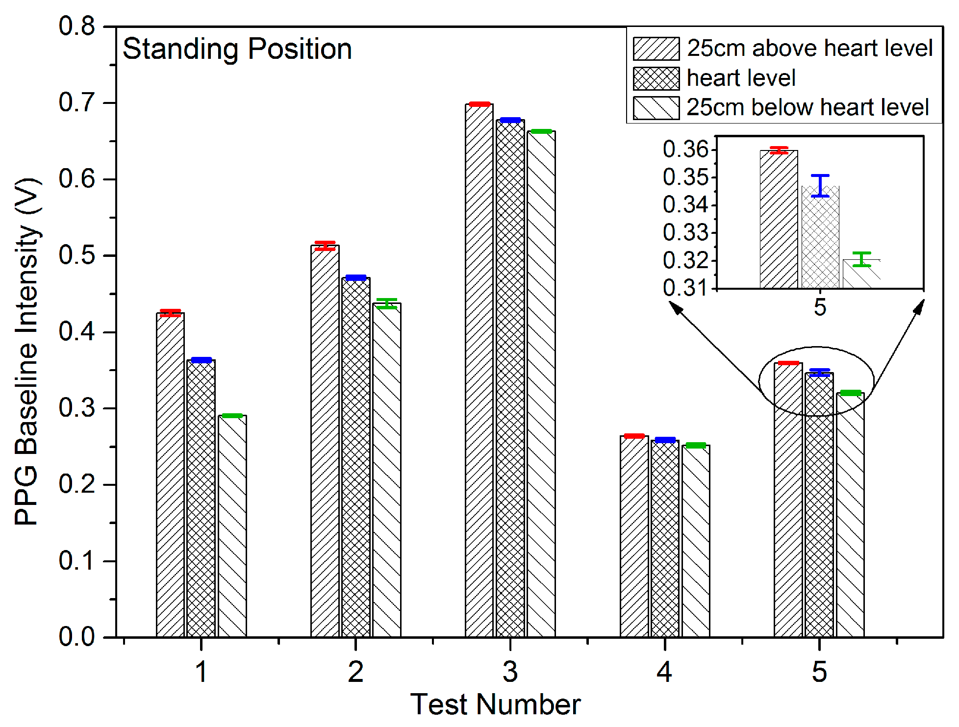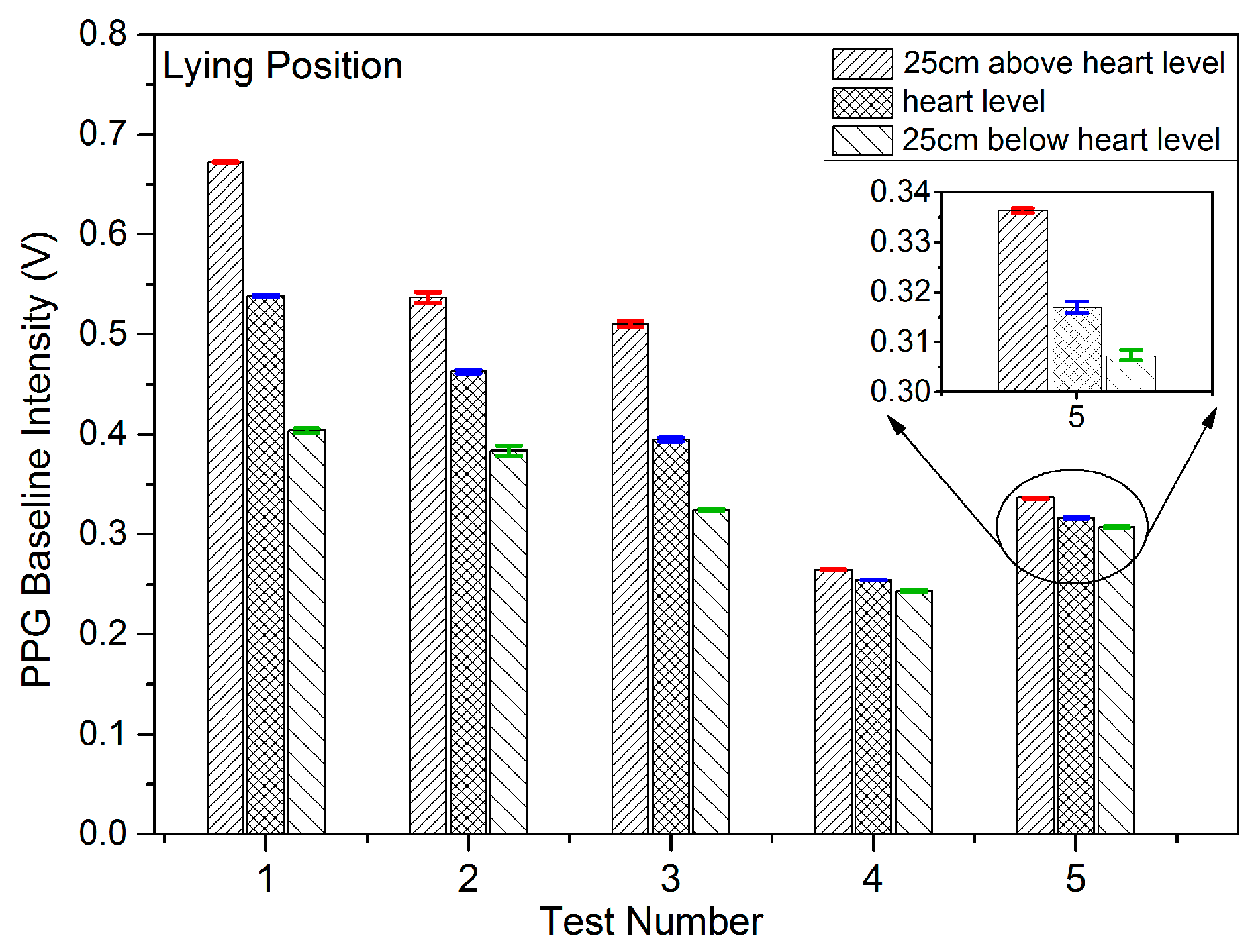 Results were recorded initially for five subjects being in the sitting, standing and lying positions in order to study the effect on the PPG signals of VHD variation. In each measuring position, the height of the finger sensor probe was set at three different levels, 25 cm above heart level, at heart level, and at 25 cm below heart level with support for 2 min in each position. The PPG sensor probe was maintained in the normal position on the finger at all times. The PPG signals from the five subjects were captured at the three different vertical levels for which the subjects were in the sitting position, standing position, and lying position. Figure 6, Figure 7 and Figure 8 illustrate the data of these tests for each case of body position respectively.