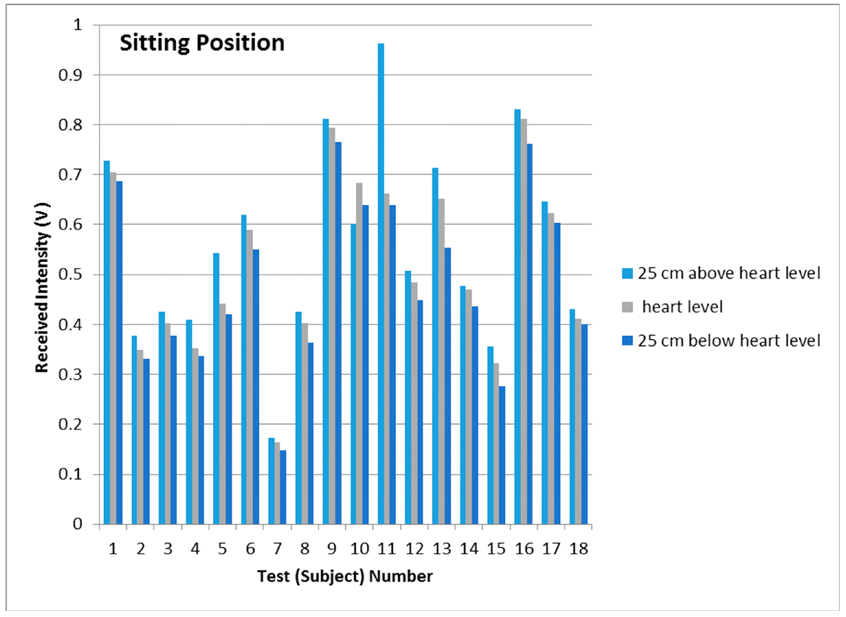 The pilot study of this investigation PPG level was based on 18 healthy adults and involved 9 males and 9 females. Each participant was required to be subjected to three tests in which the finger sensor probe position relative to the heart was varied (for the sitting position only). Hence, there are a total 54 individual measurements with an effect size of 0.043. The PPG level was measured at the heart level (level 0), 25 cm above heart level (level 1) and 25 cm below heart level (level 2). There is a small but consistent change of PPG amplitude when the vertical height is changed (as is in evidence in Figure 9). In order to study an association between PPG level and vertical height difference (VHD), a multiple linear regression and correlation was performed and the results of this analysis are shown in Table 8. The outcome variable is PPG level and predictor variable are gender and the finger sensor probe positions (level 1 and level 2). The probe position at heart level (level 0) was used as the reference. It can be seen from Table 8 that the p-value for each predictor variable to the outcome is greater than 0.05 (0.361 for gender, 0.521 for level 1 and 0.599 for level 2) which means there is no association between predictor variables to the outcome. In summary, even though there is a discernable change of PPG level according to the vertical height difference (Clear in Figure 9), the height 25 cm above and below the heart level do not significantly affect the PPG level or the blood pressure.