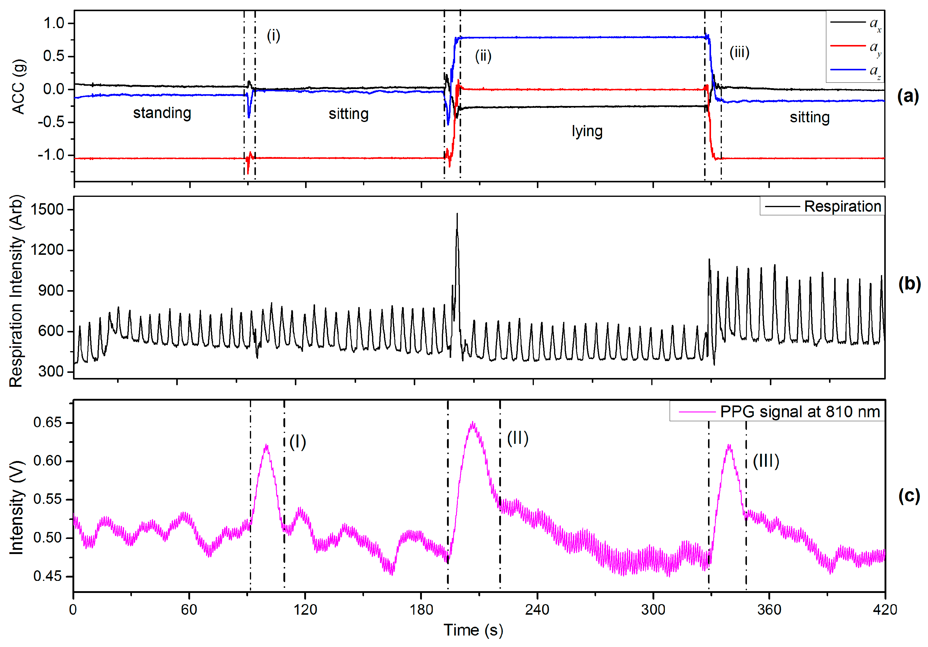 (a) ACC; (b) respiration and (c) PPG signals recorded from changing body positions.