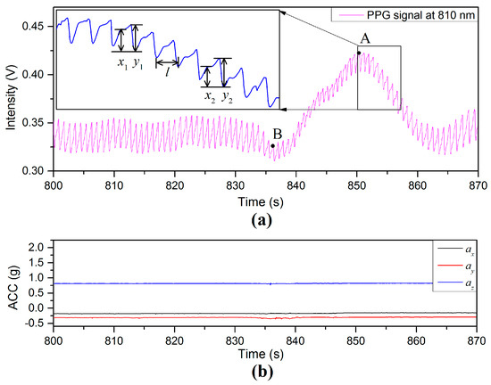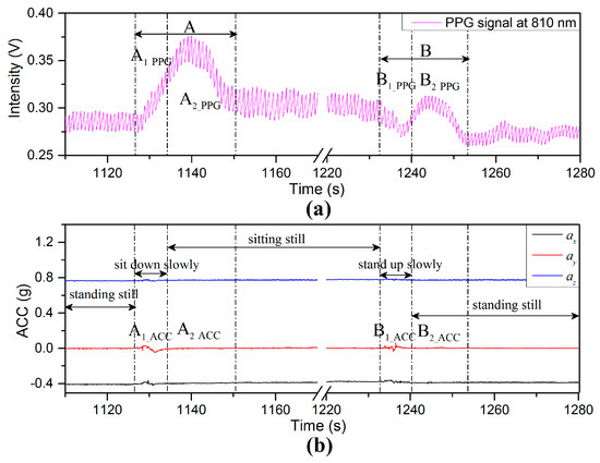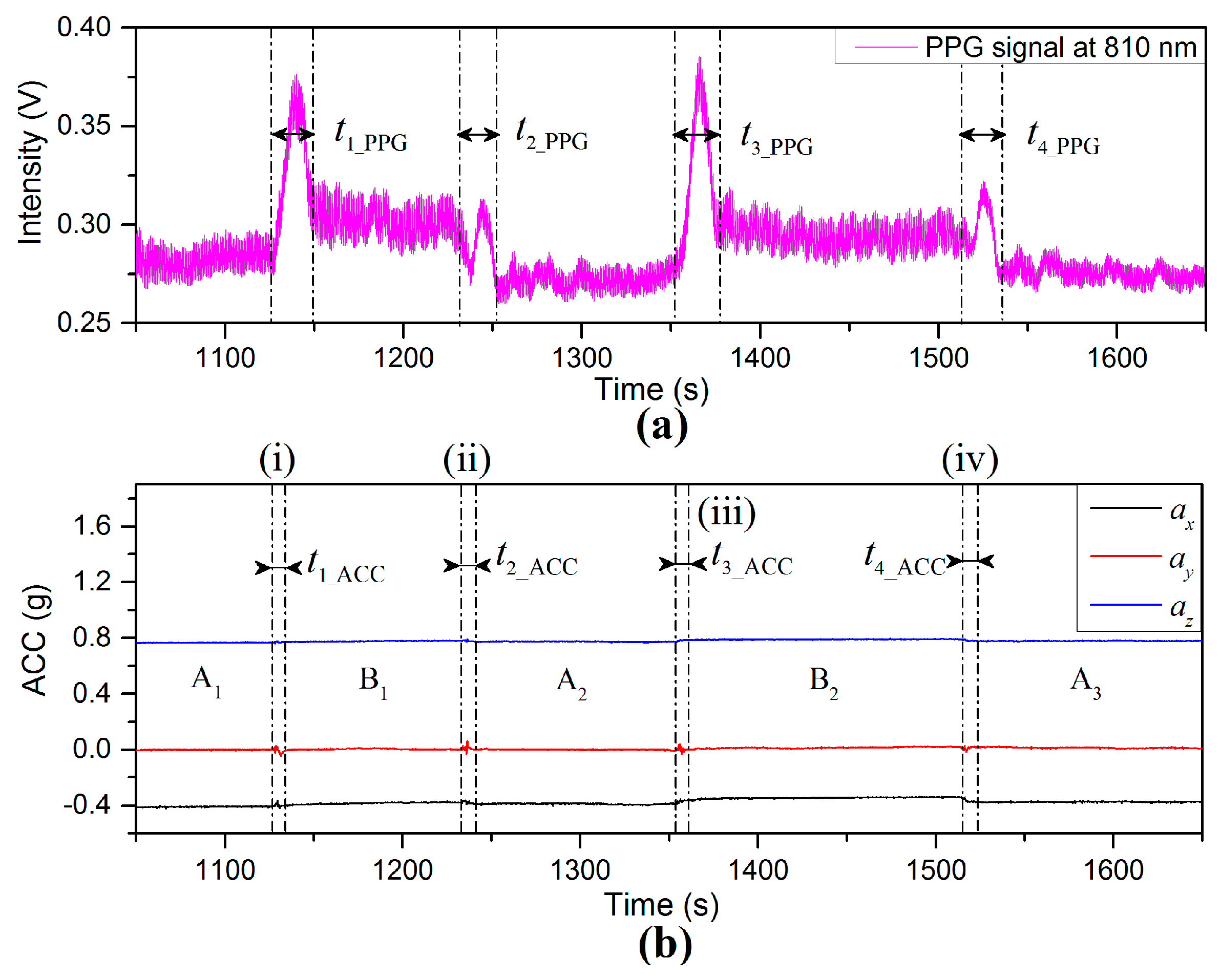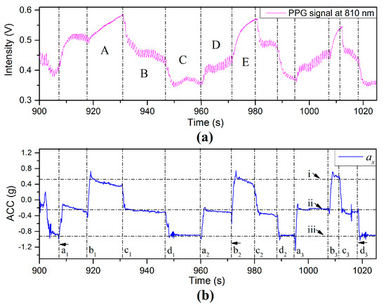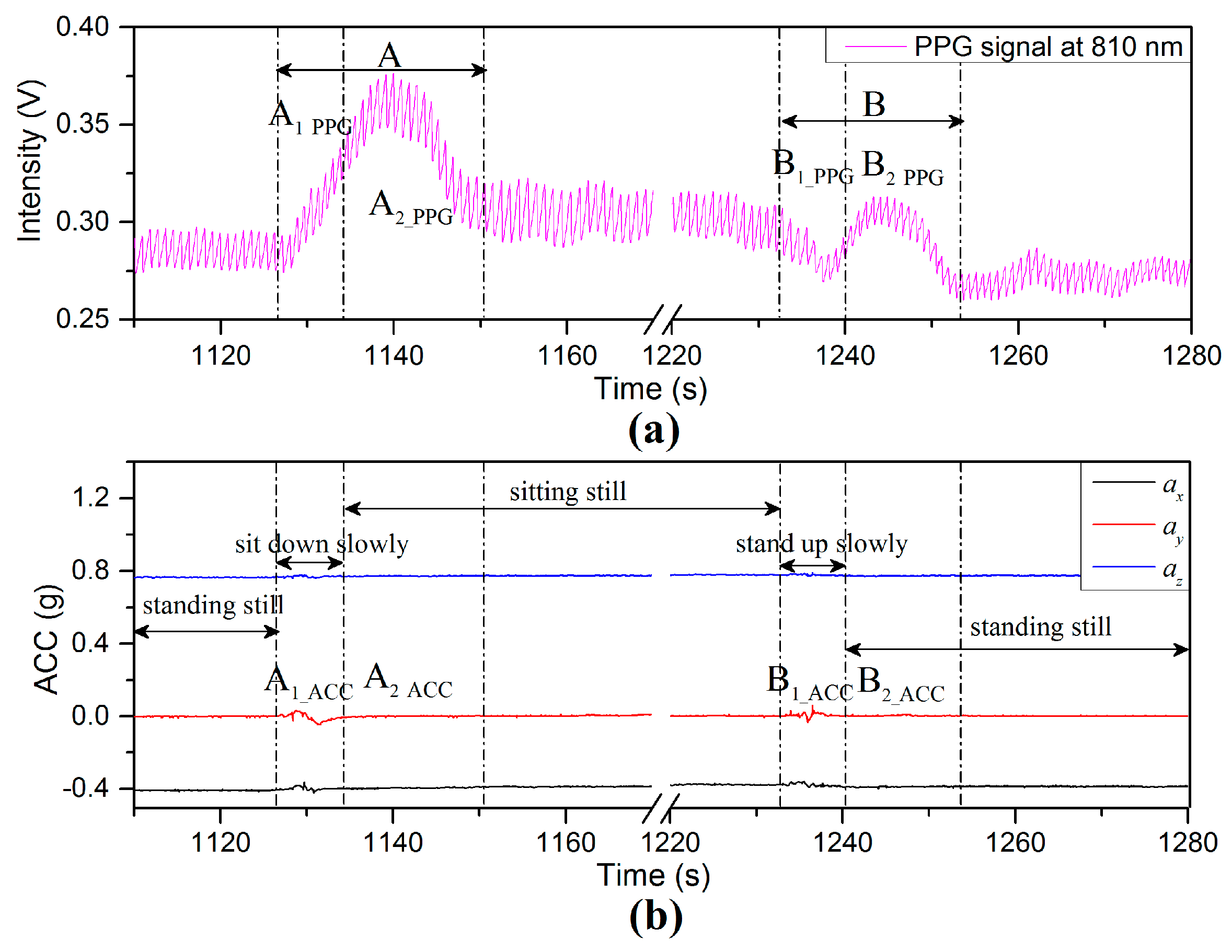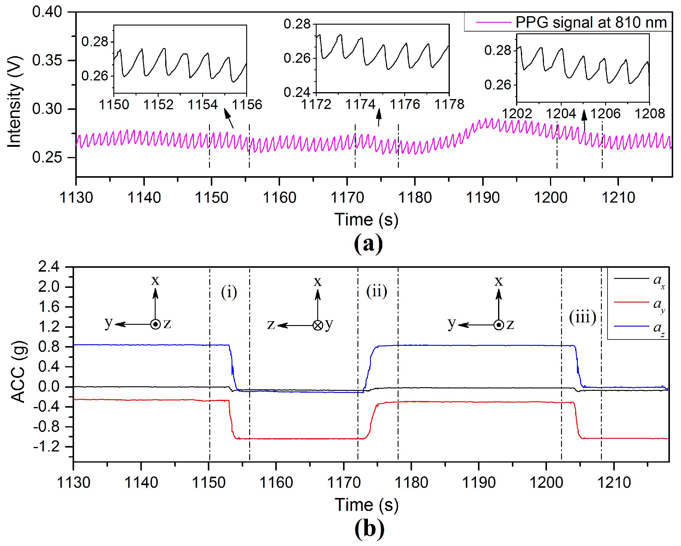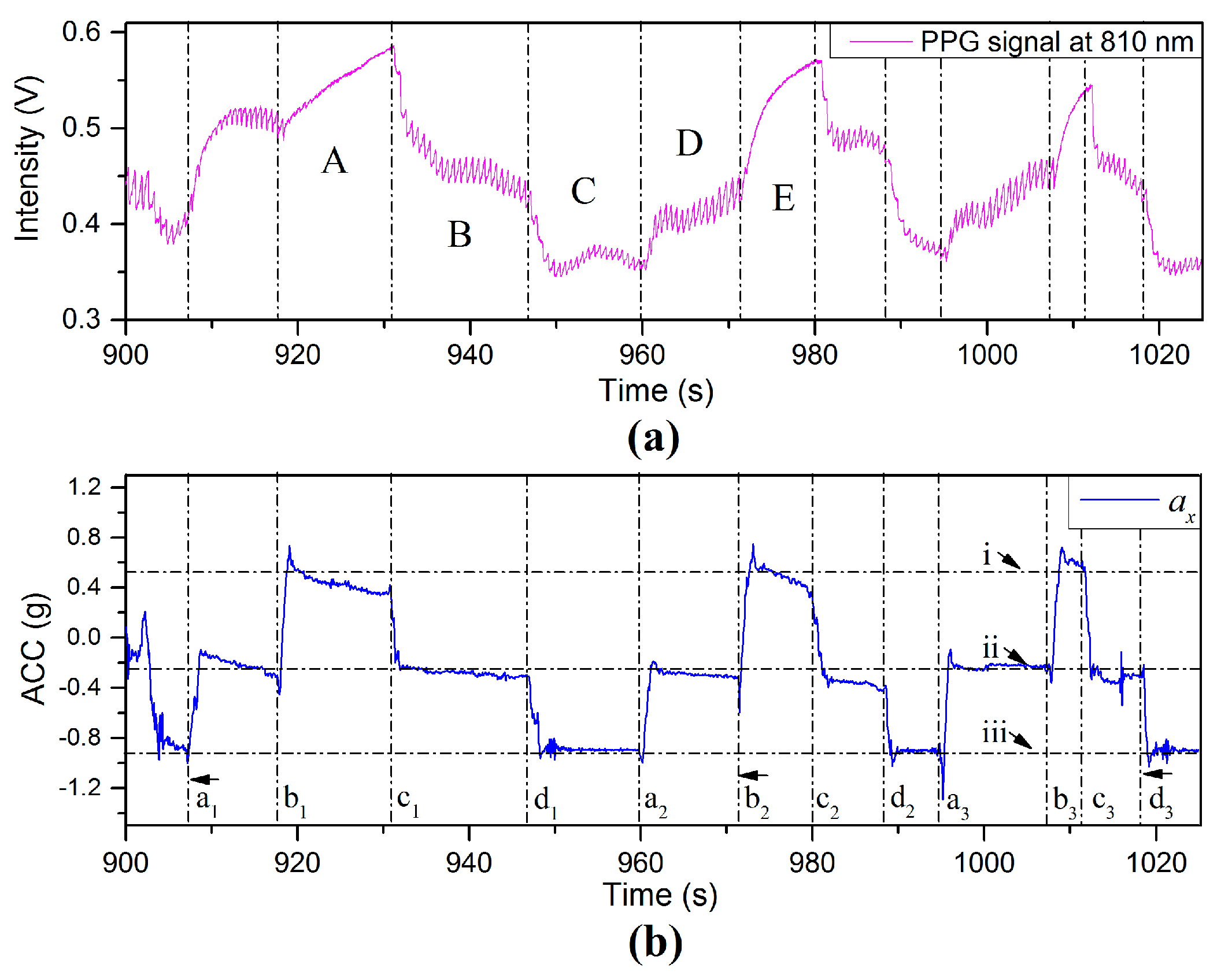 (a) PPG and (b) ACC signals for which the subject maintained the finger sensor probe at the same height above the floor and varied the VHD by changing body positions.