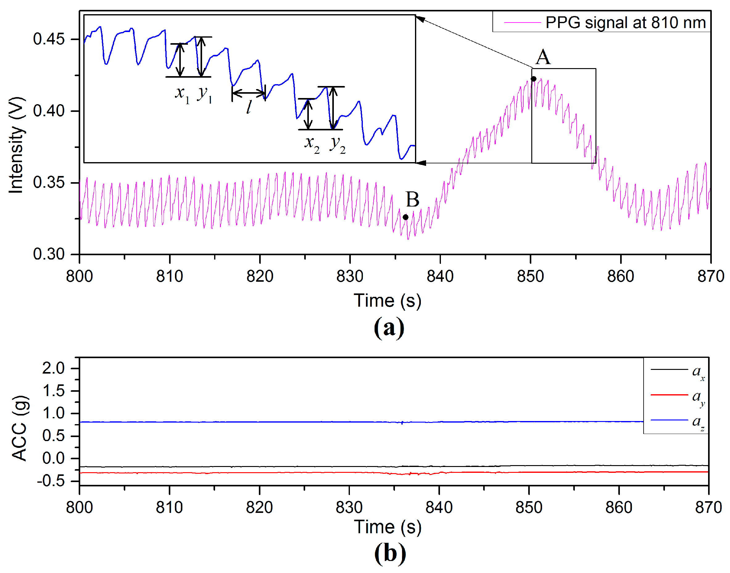 Many types of physiological influences can result in an increase, or decrease of the local BP at the measuring site, which affects the BL and the AM of the PPG signals. Figure 13 illustrates PPG and acceleration signals during a deep yawn event. As can been seen from the intensity of PPG signal in Figure 13a, the average value of BL is 0.35 V before the deep yawn. The activity of a deep yawn started at the time of 835 s. The next 25 s shows a PPG-fluctuation triggered by the yawn event. Repeated experiments (40 times) show that: (1) the value of AM tends to be restricted and (2) the BL tends to continue without significant variation. A zoomed PPG signal in the time period of 852–857 s is included as an inset on the top left of Figure 13a. The interval is the instantaneous period of the PPG waveform, at a given point in time, and has been used to determine HR. Two examples of the AM of the diastolic peak are illustrated by and , whereas and are examples of the AM of the systolic peaks [25]. The mean ratio of diastolic peak to systolic peak during the period 810–830 s is 0.403 (±0.023) in Figure 13 prior to the yawning event. During the yawning event, the value of the ratio (e.g., 0.83 at the peak point, A) is larger than that of (e.g., 0.52 at the valley point, B), and the BL/AM ratio is also affected during the PPG fluctuation. Even though the PPG signal is highly affected by the yawn activity, the interval can still be reliably used to calculate HR [26,27].
