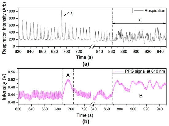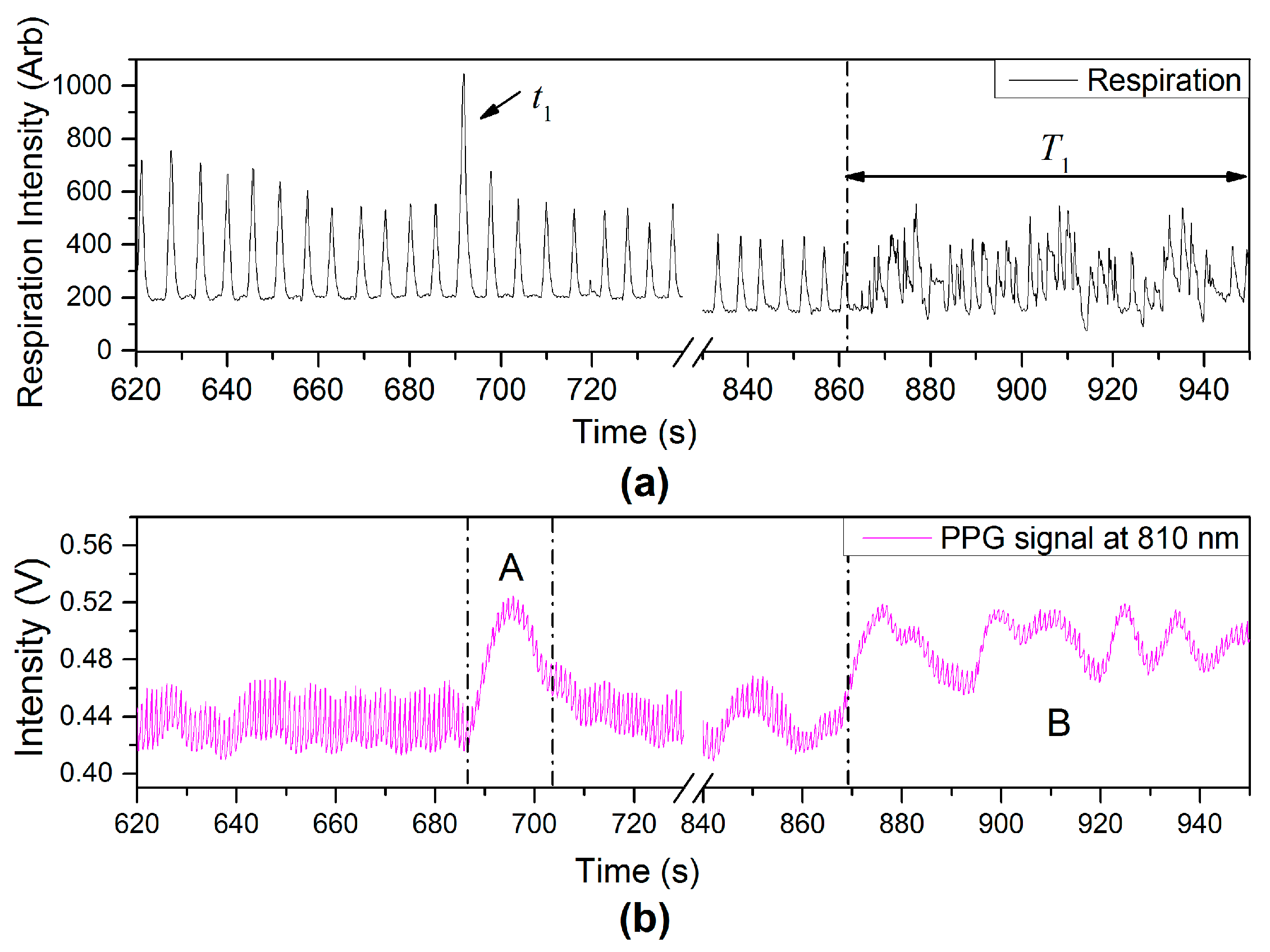 Another type of physiological variation from variation of breathing pattern, deep breathing () and talking () events, can also affect the PPG signals as observed in PPG-fluctuations [region (A) and (B)], shown in Figure 14.