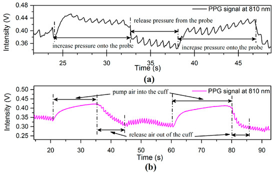 The PPG signal affected by local BP variations at the measuring site due to (a) external pressure applied on finger probe and (b) external pressure applied on wrist by processing the inflatable-cuff type blood pressure monitor.