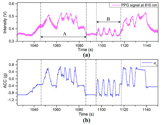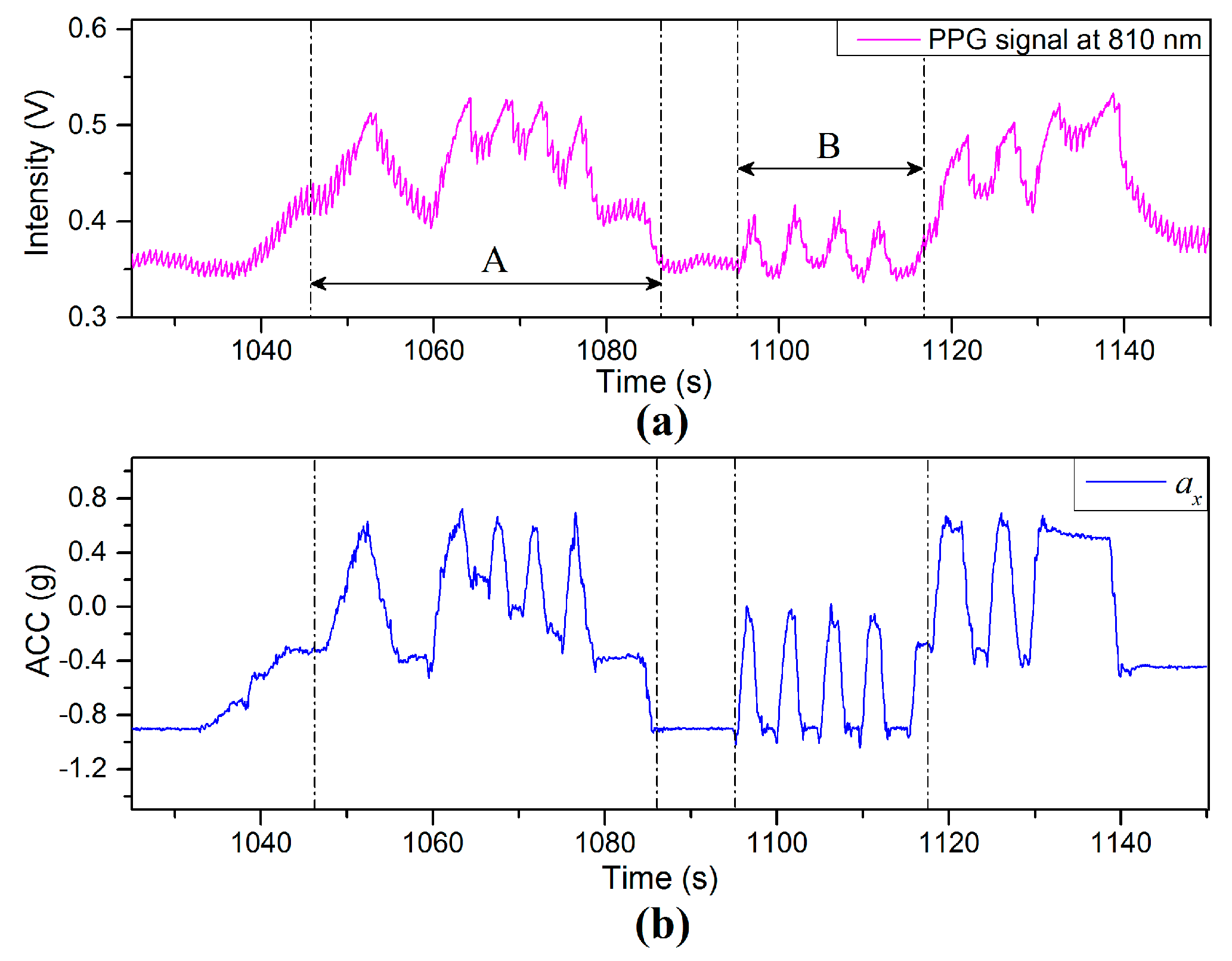 Figure 18 shows the PPG and acceleration signals captured in the process of swinging the arm up and down repeatedly with short resting time intervals (less than 5 s). In Region (A) the finger sensor probe is subject to rapid up-and-down motions between a height of 35 cm above heart level and heart level. Region (B) corresponds to the finger sensor probe being quickly and repeatedly moved up and down between heart level and a height of 35 cm below heart level. Results show that the values of BL in Figure 17a vary in a manner similar to the values of X-axis acceleration in Figure 17b and PPG signals tends to be highly affected by the VHD variation.