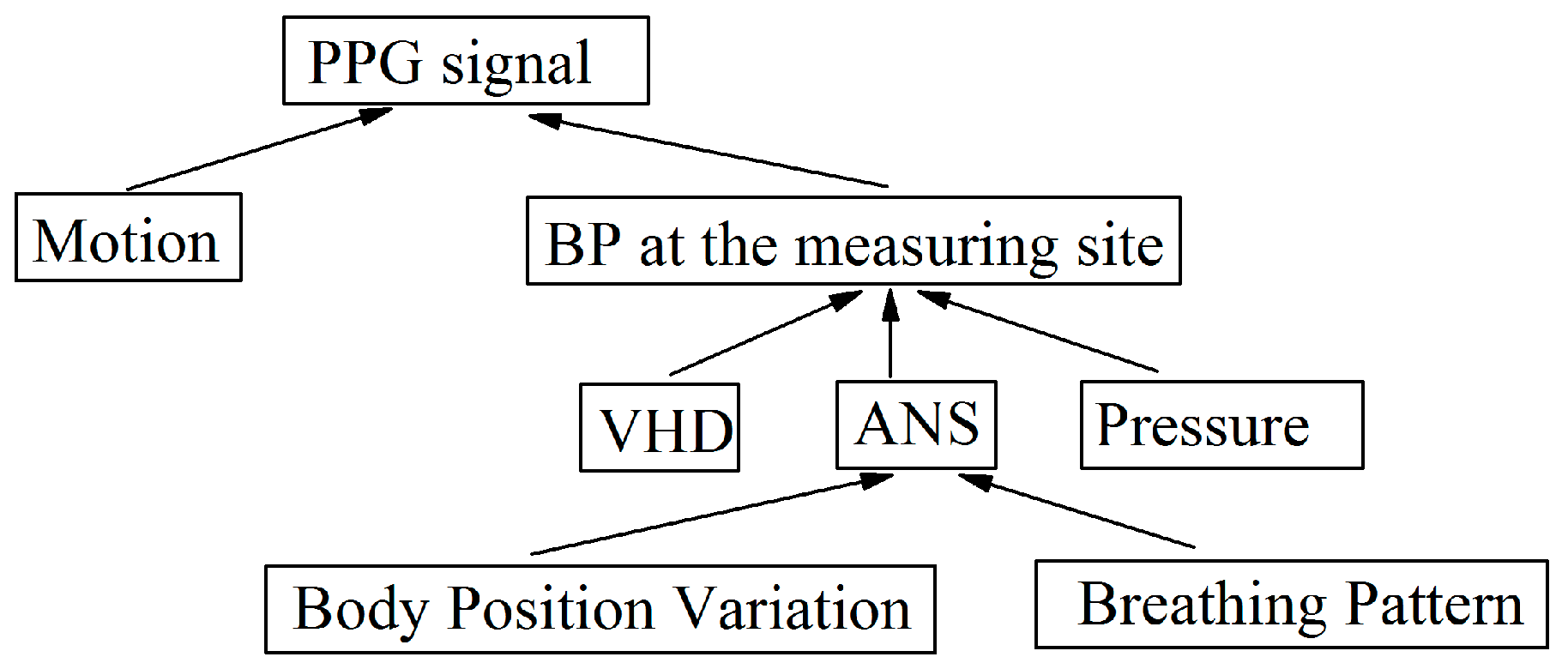 The Autonomic Nervous System (ANS) of the human body, as part of the peripheral nervous system, can be disturbed by body motion events, leading to unconsciously varying vital physiological parameters including body temperature, blood pressure, respiration rate, heartbeat etc. [12]. The human ANS acts to achieve a balance between parasympathetic and sympathetic nervous systems. The sympathetic nervous system tends to adjust physiological parameters, such as increasing heart rate and blood pressure in a human body, in response to external/internal stimulating events; on the other side, the parasympathetic nervous system tends to release tension by reducing heart beat and blood pressure [13,14,15]. Research has been reported that the skin vasomotion is also modulated by the sympathetic nervous system [16]. The PPG signal, as a recordable bio signal, can also be affected by ANS when accompanied by variations in physiological events e.g., exercise, breathing and motion in general.