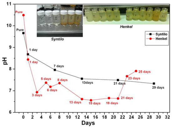 pH characterization of Castrol and Henkel coolant fluids at different degrees of ageing (days used).