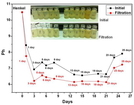 Collected coolant samples were filtered by microporous paper-type filter while examining how this process affects the pH value of the samples. The comparison of the pH values of the samples before and after filtration is shown in Figure 3, where it can be noticed that after the filtration the aged coolants’ pH values decreased by almost a full pH unit. However, the overall pH trend of the aged coolant remains the same, characterized by a monotonically decreasing trend.