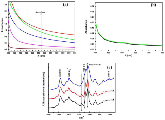 Figure 5a shows the absorption spectrum (UV-Vis) from 300 to 800 nm, and Figure 5b shows the ATR absorbance spectrum trend over 9 days. The irregular behavior is due to the additional coolant liquid added in the machine, thus changing the chemical composition of the samples as described in the previous section.