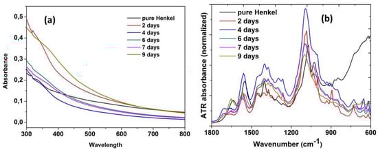 Spectroscopic characterization of coolant Henkel Multan 61-3 DF (a) absorption; and (b) ATR spectrum, for a 9 day ageing interval.