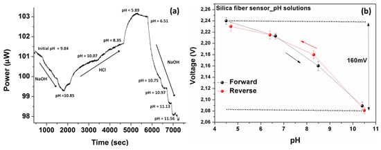 (a) Measured optical response of the silica fiber sensor standard pH solutions following dynamic changes in solutions’ acidity. The dynamic response of the sensor in successive solution’s acidity changes is clearly demonstrated. (b) The electrically converted response of the silica optical fiber sensor, as a function of the pH, exhibiting an almost linear and also reversible response with an adequate 160 mV range.