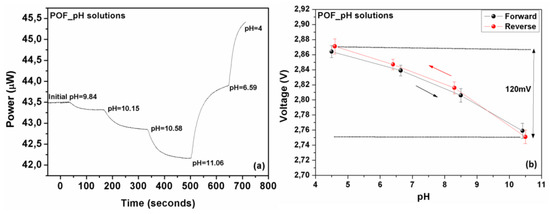 (a) Measured optical response of the polymer optical fiber sensor standard pH solutions following closely dynamic changes in solutions’ acidity. The dynamic response of the sensors in a successive solution’s acidity changes is clearly demonstrated. (b) The electrically converted response of the polymer optical fiber sensor, as a function of the pH, exhibiting an almost linear and also reversible response with an adequate 120 mV range.