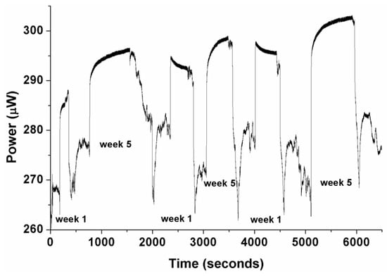 Measured response of polymer optical fiber sensor in two different samples of coolant fluid Castrol Syntilo 81BF with two different aging degrees (Week 1 and Week 5), after successive measurements. The inconsistency of the sensor’s behavior in real coolants, due probably to its deterioration in response to attack by the coolant’s specific components is clearly demonstrated.