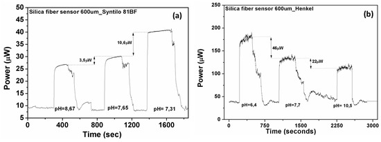 Experiments have been carried out for the performance evaluation of the developed fiber optical sensors for both silica and polymer material platforms. The diagrams in Figure 7 shows the effect of solutions’ pH index variations on the transmitted optical power in the case of silica fiber. The variation of the pH levels of the under study solution achieved by adding HCl or NaOH solutions in different (random) time points respectively during the experimental procedure. During the sensor characterization the acidity of the solutions was also measured with an electrochemical pH meter. As illustrated in Figure 7a, successive changes of solution’s pH index produces corresponding changes to the optical power of the optical fiber sensor with very good dynamic response and reversible characteristics.