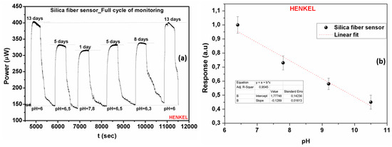 Based on the availability of coolant fluids, another set of measurements was performed in order to assess the reversibility of the employed sensors along a full cycle coolants’ use. Figure 11a presents the optical response together with the time response characteristics of the silica fiber sensor during a full ageing cycle experiment of the Henkel Multan coolant. Following a number of additional sensor characterization measurements the electrical response was also derived for the entire working pH range of the Henkel coolant (Figure 11b). The specific pH range was chosen taking into consideration the different ageing intervals of the coolant liquids, as already shown in Figure 2. Based on this fact, the determination and prediction of their full life cycle can be achieved from the exhibited monotonic linear behavior.