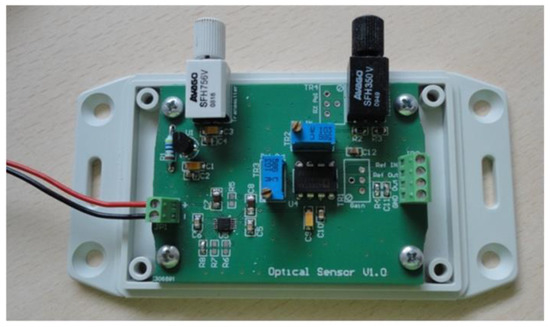 The driving circuit board and the interface of the optical sensor were further improved and optimized in terms of footprint dimensions in order to be accommodated in an environmentally robust wireless node unit. A new low cost PCB was designed, as can be seen in the inset photograph of Figure 13, in order to accommodate inside the node module of the LED source (IF-E99, Industrial Fiber Optics 650 nm with maximum output power of 1 mW) and the photodetector (Photodarlington configuration IF-D93, Industrial Fiber Optics). The chosen photodetector has an integrated high optical gain and performs linearly over a broad range of temperature. The PCB hosting the LED source and the photodetector utilizes two separate voltage rails (Figure 13). 5 V is used to power the LED and 3.3 V is used to bias the output of the photodetector. The LED is fed through a 10 KOhm resistor resulting in 2.5 mW of consumption, while the photodetector is biased through a 120 Ohm (R2) resistor adding another 90.75 mW power. The total power drain on the optical board is 93.25 mW. The amount of dissipated power is fairly small and would not impact the autonomy of a battery powered device. In order to avoid a noisy power supply, which could degrade the accuracy of the optical transceiver, a low noise Low Dropout (LDO) DC-DC regulator from Texas Instruments (Dallas, TX, USA) was chosen. The LM3480IM3 can exhibit almost 70 dB of Power Supply Rejection Ratio (PSRR) over a broad range of frequencies, resulting in a stable output with minimal voltage ripple. This IC is used only for the 5 V rail, while the rest of the system is operating at the 3.3 V level. This way, the analog output of the photodetector can be directly digitized and processed in the microcontroller unit (MCU) of the wireless node, without the need of additional interface circuitry.