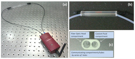 (a) Measuring apparatus with the sensing head connected to the wireless sensing node unit; (b) Photograph of the glass measuring cell with the two interconnected cylindrical inner compartments for the accommodation of the fiber optic sensing head and the coolant flow system; (c) Photograph showing in detail the dual tube glass cell.