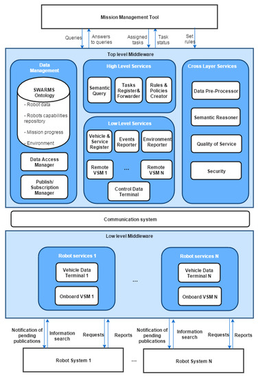 Ontologies provide a formal specification of conceptualization in a well-defined and unambiguous manner; thus, they facilitate knowledge sharing and reusing. They are widely used to formally represent information in many domains, such as semantic web [6], smart home [7], and healthcare [8]. The SWARMs project also adopts ontologies to model all information that is necessarily exchanged between vehicles. A networked ontology is developed as a part of the SWARMs semantic middleware. As shown in Figure 1, the semantic middleware is defined to provide interactions between vehicles and the Mission Management Tool (MMT), which is located onshore or on a vessel and is responsible for the generation of missions, assignment of tasks to robots, and supervising the mission. More importantly, the semantic middleware can offer a variety of common services (e.g., security, context awareness, and publishing/subscription) for vehicles and MMT in the SWARMs project.