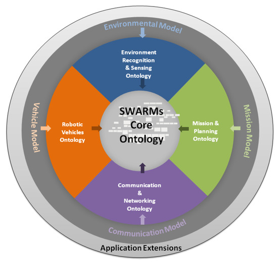 To fulfill all the requirements presented in Section 3, the SWARMs ontology is designed as a network of ontologies. The overview of the structure of the SWARMs ontology can be seen in Figure 2. As depicted in Figure 2, the SWARMs ontology mainly consists of four domain-specific ontologies which model common concepts and aspects of certain domains, including mission and planning, environment recognition and sensing, robotic vehicle, and communication and networking. All these domain-specific ontologies are interlinked through a core ontology. In addition, the SWARMs ontology could be enriched with application extensions to suit certain use cases and scenarios. In the following sections, the specific design for different domain-specific ontology model and their relationships in the SWARMs ontology will be presented.