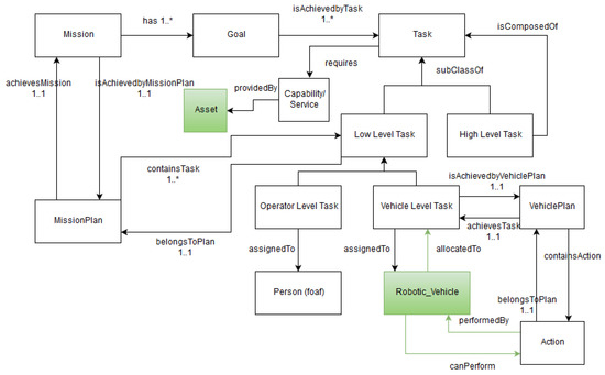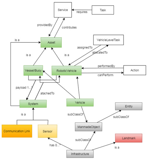 The SWARMs ontology aims to model information mainly related to four domains. In order to link domain-specific ontologies and provide a coherent representation, a core ontology, shown in Figure 3, is presented. In Figure 3, the main concepts from the mission and planning ontology are depicted in white while concepts from the environment recognition and sensing domain are marked in grey, yellow, and red. In addition, ontology elements from the communication and networking domain and concepts from the robotic vehicles domain are displayed in orange and green, respectively.