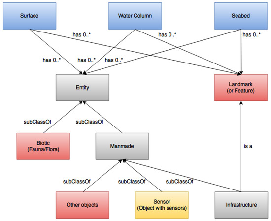 Entities can be Biotic, i.e., animals or plants, or ManmadeObjects. Landmarks (or Features) represent all other kinds of objects that can be considered/recognized as landmarks, e.g., big rocks, as well as geological formations on the seabed. Infrastructures are considered usually as landmarks due to their size and construction records, i.e., are registered and mapped, and are also obviously manmade objects (polymorphism). Other objects, besides Infrastructures and objects with Sensors (e.g., AUV and ROV) are also considered, namely since it could be important in a mission or task to find/recognize them, e.g., oil pipes or components of an infrastructure.
