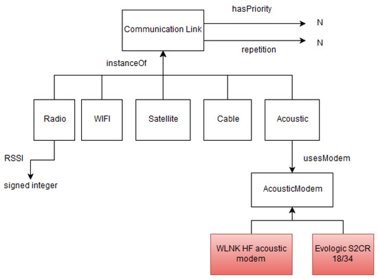 This information model, shown in Figure 7, describes the communication links available in SWARMs to interconnect the different agents involved in a global mission execution and supervision, i.e., the ashore control station, support ships, USVs, AUVs, and ROVs.