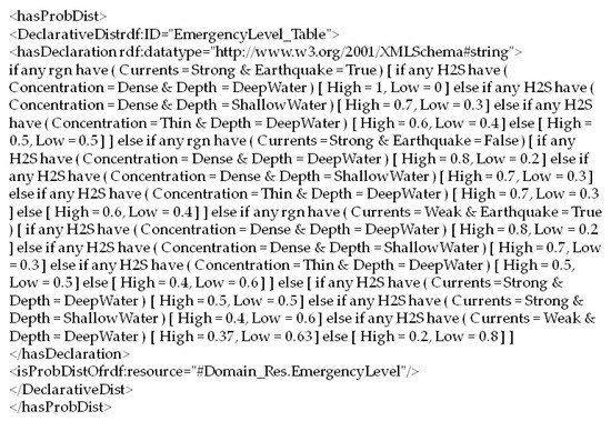 The probabilistic ontology, shown in Figure 10, models that the weather and wind speed in the investigated sea region can affect the currents in the same region. Currents, along with the concentration of H2S, depth of H2S, and earthquake occurrence in the sea region, are the influential factors to estimate the emergency level of the polluted sea region. The probabilistic ontology uses ontology constructs defined in the PR-OWL ontology to annotate probability information of those factors. For instance, the joint probability distribution of emergency level, shown in Figure 11, can be annotated using OWL constructs shown in Figure 12. Specifically, the probability distribution of EmergencyLevel is annotated as a string by using a hasDeclaration datatype. For the demonstration purpose, the probability information shown in Figure 11 is directly provided by marine experts.